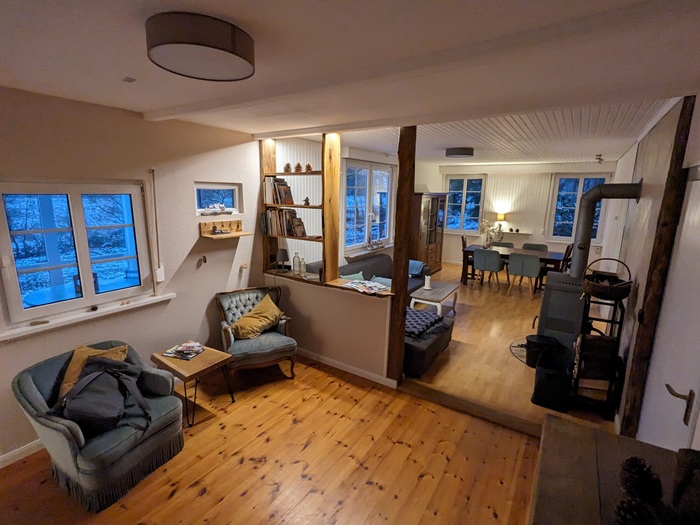 Durch den Wintergarten gelangt man in die Diele und den offenen Wohnbereich mit Esstisch. In diesem zentralen Raum befindt sich der Holzofen, der schnell für wohlige Wärme sorgt. Im Essbereich finden 6 Personen bequem Platz, das Sofa lädt zum gemütlichen Abend am Feuer ein. Einen Fernseher gibt es hier nicht.